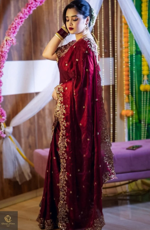 পুরো শাড়ি জুড়ে স্টানিং সিকুয়েন্স ও এমব্রয়ডারি কাজ